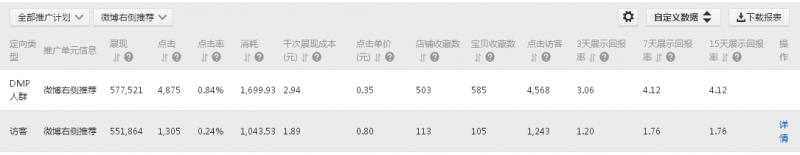 DMP定向可以根據官方總結出的類目點擊率高的人群創建,進行測試投放。比如“瀏覽收藏頻次中未購買”、“最近7天店內寶貝頁總瀏覽量”、“最近30天店內寶貝頁總收藏量”等人群。