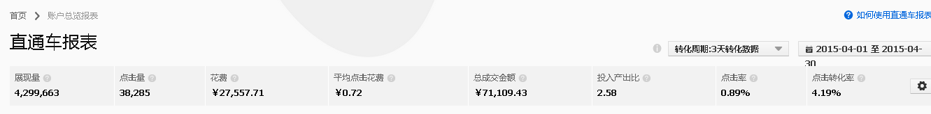 數據分析:從以上數據可以看出,4月份賬戶的ROI為2.58,PPC為0.72元。直通車效果呈現比較穩定的狀態。