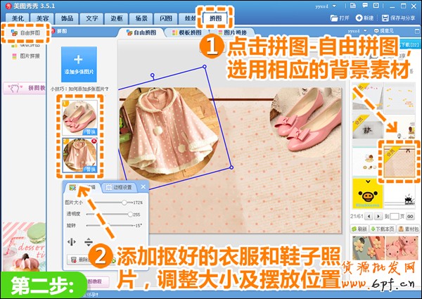 二、當把三張素材全部摳完后,接下來我們就開始拼圖,首先我們再“拼圖”的菜單招待自由拼圖這個功能,然后選好自己喜愛的背景,把剛才摳好的素材添加進來,調整好圖片大小、角度,擺放好位置。