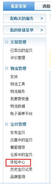 第二步:在頁面的最左側找到“寶貝管理”,點擊“體檢中心”;