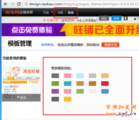 5.淘寶雖然有一些免費的模板,但是淘寶裝修模板就跟QQ空間是一樣的,一些漂亮一點的模板是需要錢的,但是如果你有PS功底的話,也可以自己設置模板的,你可以在網店裝修的頁面上方選擇布局和模板設置,設計一個有個性有特色的淘寶網店。(如下圖)