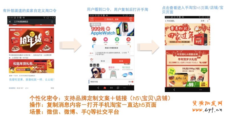 6月15日,無線營銷新功能“淘口令”正式上線,由千牛平臺承載。通過一段文字,淘口令可以在商家和用戶之間構建一條特殊的通道,把買家直接導向商品詳情頁、店鋪首頁、活動頁面或任何頁面。無論文字的源頭來自微信還是陌陌,網頁還是微博,淘口令都可以輕輕松松通過一個復制的動作呼出頁面,把流量瞬間引入指定頁面。