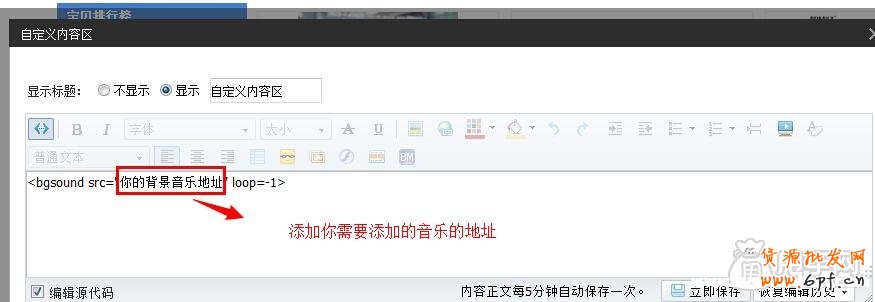 眾所周知,升級到旺鋪以后就沒有了公告欄,那么我們最好添加在左側的“自定義內容區”中。代碼添加方法跟普通店鋪是一樣的,也要留意把添加的代碼放在其他代碼的最后面。除此之外,還要注意如果是新添加的自定義內容區,則必須在內容區里有其他的內容,否則光添加背景音樂代碼保存后就會自動消失。