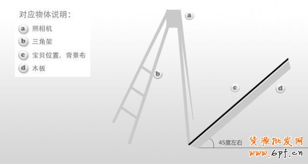 1.首先介紹衣服與相機(jī)位置。自己設(shè)計(jì)一個(gè)桌子,木板擺衣服的時(shí)候是180度,擺好再改成45度。找一塊訪滑的全白背景布,然后相機(jī)設(shè)置在A外位置,最好用三角支架不然很容易拍攝出模糊的衣服,并且相機(jī)的拍攝角度要與衣服的斜角成90度,這樣視線最好,不然很容易引起視覺(jué)偏差。