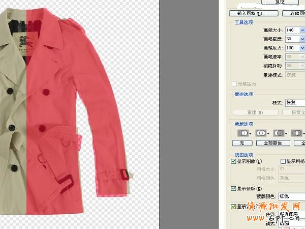 液化紅色的那半在上一圖層眼睛不關(guān)然后在下面衣服上液化,液化時(shí)選擇顯示背景。