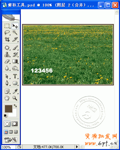 如果圖片的背景色彩或圖案比較一致,使用修補工具就比較方便。具體的操作是,選取修補工具,在公共欄中選擇修補項為“源”,關閉“透明”選項。然后用修補工具框選文字,拖動到無文字區域中色彩或圖案相似的位置,松開鼠標就完成復制。修補工具具有自動匹配顏色的功能,復制出的效果與周圍的色彩較為融合,這是仿制圖章工具所不具備的。