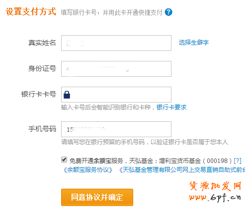 4.填寫完支付寶和身份信息后,點擊確定后,還需要用戶填寫銀行卡卡號并確定同意協議,實名認證就此完成。