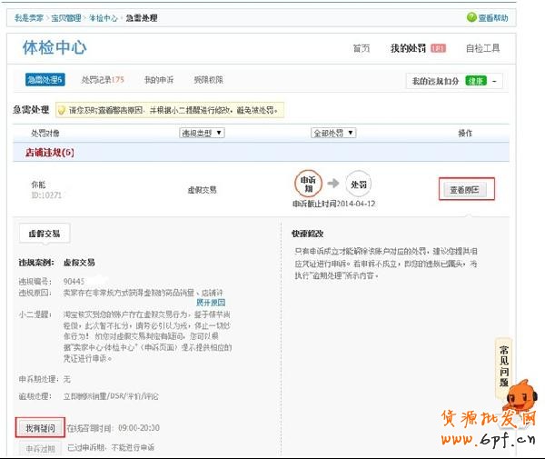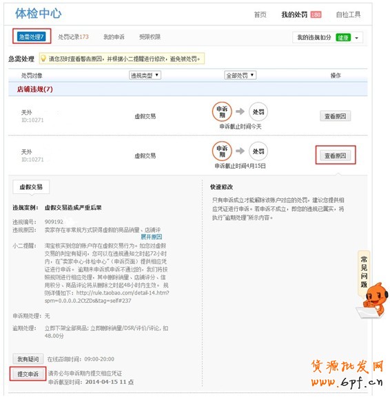 第二步:找到虛假交易訂單,點(diǎn)擊“查看原因”,就會(huì)看到淘寶處罰你的詳情原因,若對(duì)這些處罰有什么疑問(wèn)或者異議的,可以在線咨詢(xún)淘寶客服。