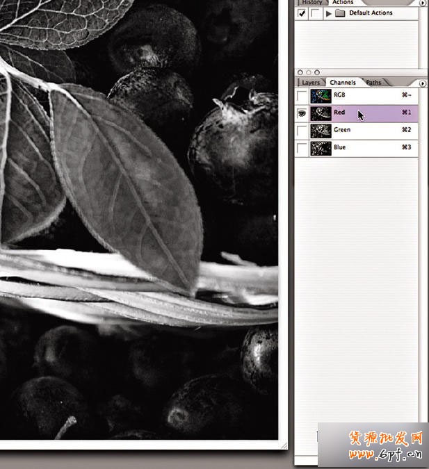 3、點(diǎn)擊“圖層”--“調(diào)整”--“通道混合器”,我們?cè)谏弦徊襟E中看到藍(lán)莓的質(zhì)感在紅色通道中表現(xiàn)情況比較理想。所以,我們需要盡可能保留多一些紅色通道的值。另外,綠色區(qū)將葉子和藍(lán)莓區(qū)分出來,所以,綠色通道也要運(yùn)用起來。而藍(lán)色通道,我們看到噪點(diǎn)很多畫面也是比較暗,所以,這里我們現(xiàn)不動(dòng)它。跟著我們回到“圖像”——“調(diào)整”——“通道混合器”,給紅色55%,綠色45%。