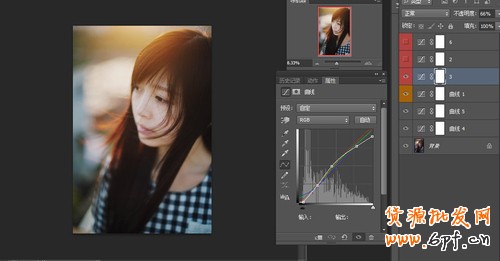 4、這一步,我們通過曲線降低高光區的,暗部則繼續加強,具體而言,紅綠曲線提高,藍調曲線降低,這樣字,色彩會更加的豐富。