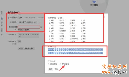 我們先要考慮好每天的預算,多少合適?設置好投放的日期,什么時候投?然后根據我們前面做的分析,選擇地域和時間,投放方式我們運用均勻投放、地域投放。客戶按照我們多成交占比金額的城市來進行精準投放。