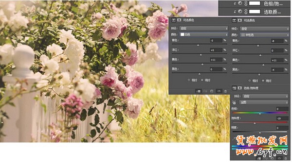 分別對花和柵欄進行調色,同時添加遠景和近景,遠景模糊調亮,近景模糊調暗;另外,桃色跟左邊的花的方法一樣,最終的效果就是要融入環境。