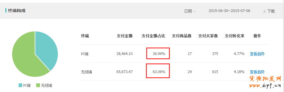 以上是我做的一個(gè)店鋪?zhàn)罱恢苷麄€(gè)店鋪PC端和無線端點(diǎn)擊成交情況,以上用紅色方框表示的是兩者整店的成交金額占比,PC端占比36.94%,無線端占比卻達(dá)到了驚人的63.06%。當(dāng)然這個(gè)占比情況,每個(gè)行業(yè),每個(gè)店鋪的實(shí)際情況對會(huì)不一樣,我們需要根據(jù)PC端和無線端流量情況,支付轉(zhuǎn)化率以及兩端的流量成本來進(jìn)行合理的投放比例設(shè)置,只有這樣才能最大化自己的ROI(投入產(chǎn)出比)。