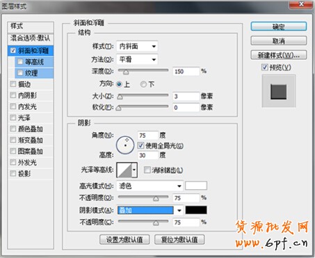 跟著,我們需要對“斜面和浮雕”參數進行調整,參數設置如下圖所示: