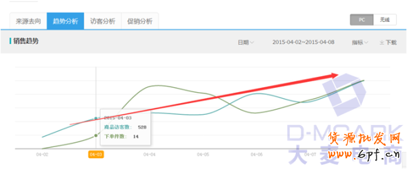 3、查看最近產(chǎn)品訪客轉(zhuǎn)化趨勢,選定的產(chǎn)訪客和成交趨勢是不斷在往上漲的,也就是說訪客增加,轉(zhuǎn)化率沒有下降的產(chǎn)品,這樣的產(chǎn)品才會上升的更快。如下圖,訪客和下單件數(shù)都不斷增,這樣的產(chǎn)品是很有潛質(zhì)的。這樣的寶貝權(quán)重上升才會更快,排名更加靠前,獲取的免費流量更多。更加利于打造高銷量的款式。