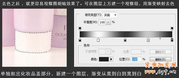 5.運(yùn)用上面的方法把化妝品的每個(gè)圖層都單獨(dú)摳出,接著使用黑白漸變和加深減淡工具處理寶貝細(xì)節(jié)。