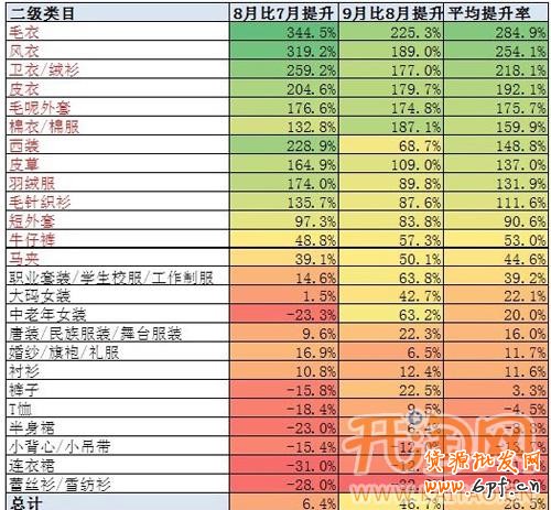 天氣漸漸轉(zhuǎn)冷,經(jīng)歷了7月女裝淡季之后,女裝網(wǎng)店迎來了秋裝、冬裝的銷售高潮。如何讓自己的網(wǎng)店能夠掌握這個潮流?如何開網(wǎng)店的小編覺得,首先要知道市場的方向,小編給大家整理了女裝12個二級類目的8月和9月的市場成交金額平均增長率。