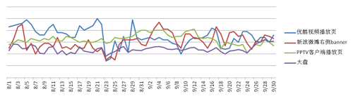 從圖中可看出,以上三個(gè)媒體點(diǎn)擊率(CTR)均高于站外大盤均值水平,優(yōu)酷和新浪微博的流量資源同比也更加明顯。
