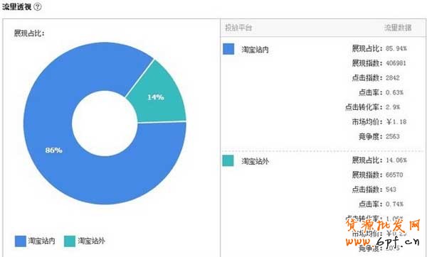 其實有一個比較穩健的方法,那就是等關鍵詞調整基本穩定后,可以考慮開站外搜索推廣了,為啥呢?因為關鍵詞搜索就是你的根基,在根基不穩定前,會導致你的站外搜索推廣更不穩定,當你的站內關鍵詞初步穩定后,就可以用上面根據市場數據得出的投放比例當做初始投放比例來投放站外了,初始投放比例設置之后,我們會積累到寶貝實際的站外投放數據,也就是這個數據: