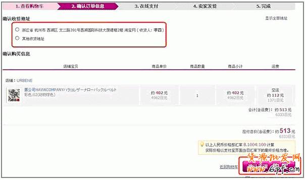 在查看購物車頁面確定了要購買的寶貝后,再選擇“立刻購買”就可以進入批量購買寶貝的下單頁面,確認購買信息: