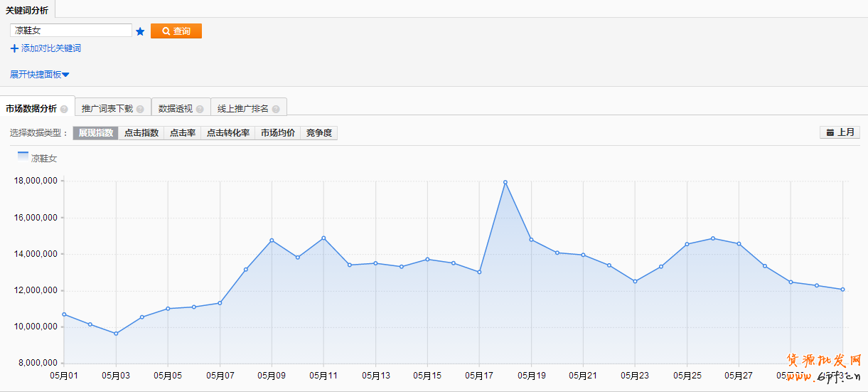 由上圖可知:過(guò)去30天內(nèi)涼鞋女的整體的市場(chǎng)展現(xiàn)指數(shù)是呈上升趨勢(shì),隨著天氣轉(zhuǎn)熱整體的市場(chǎng)競(jìng)爭(zhēng)也在明顯上升,所以市場(chǎng)競(jìng)價(jià)也有慢慢上升。假如現(xiàn)在天 熱了開(kāi)始推廣寶貝,那么我們還是從養(yǎng)關(guān)鍵詞開(kāi)始,同樣的綜合排名勢(shì)必要出高于別家寶貝的出價(jià),因?yàn)閯e家寶貝早已預(yù)熱,關(guān)鍵詞質(zhì)量得分也已經(jīng)養(yǎng)起來(lái)了,所以 要在競(jìng)爭(zhēng)度還小的時(shí)候就開(kāi)始預(yù)熱寶貝,把關(guān)鍵詞的質(zhì)量得分養(yǎng)起來(lái)。