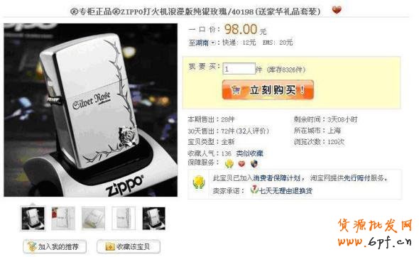 F 庫(kù)存因素:我們的庫(kù)存比較多,而銷量又比較小的時(shí)候,我們可以適當(dāng)把價(jià)格壓下來,而當(dāng)我們的庫(kù)存較小,而銷量又比較大的時(shí)候,我們也可以把價(jià)格抬高。當(dāng)然,快遞費(fèi),時(shí)間成本,和精力成本,還有其他各種各樣的因素,都應(yīng)該適當(dāng)考慮到,即使他們并不是主導(dǎo)因素。低價(jià)策略不應(yīng)該是主導(dǎo)策略,作為小賣家,在沒什么剩余的情況下,長(zhǎng)期低價(jià)只會(huì)虧,所以,賣家更應(yīng)該把精力更多的花在完善寶貝圖片,頁面,營(yíng)銷等方面的事情來提高產(chǎn)品的價(jià)值。所以其實(shí)不必糾結(jié)于我低價(jià)就一定能賣得好這話題上?看看下面這張圖片,下面是一個(gè)賣家的ZIPPP打火機(jī)的寶貝頁面。