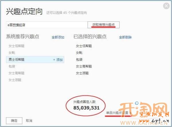 系統推薦設置同樣是填寫自己的店鋪主旺旺,這樣系統會推薦出目前你自家店鋪所有正在熱賣的關鍵詞興趣點,當你覺得系統推薦圈定的人數還不足夠的時候,你還可以使用單品興趣點的設置來增加圈定人數。