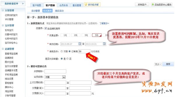 據(jù)小編了解,為了迎接即將到來的下半年銷售旺季,會員關(guān)系管理和營銷工具店鋪優(yōu)惠券將實行打通,并提供賣家使用限額優(yōu)惠券的功能,只要賣家同時開通了“會員關(guān)系管理”和“店鋪優(yōu)惠券”的功能,則可以向會員發(fā)送有使用限制的店鋪優(yōu)惠券。