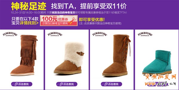 大家所熟知的雪地靴品牌有UGGAustralia、Aumu等。他們的市場定位較高,客單價在千元以上,而網購平臺上也充斥著很多廠家直銷的低端產品。JUMBOUGG將目標消費群體集中在中端市場,都市白領和成熟的年輕女性,并把2013年的營銷重頭戲放在了天貓雙十一期間,作為打開網購市場的首次戰略。原因在于:1、從人氣來說,雙十一是網購銷售熱潮,屆時人氣必定大量劇增;2、從銷售時節來說,11月份也是消費者開始搶購冬季產品的主要時期。JUMBOUGG將營銷計劃拆分成了“積累、引入、預熱、引爆”四個時間段,為雙十一的訂單爆發蓄勢。