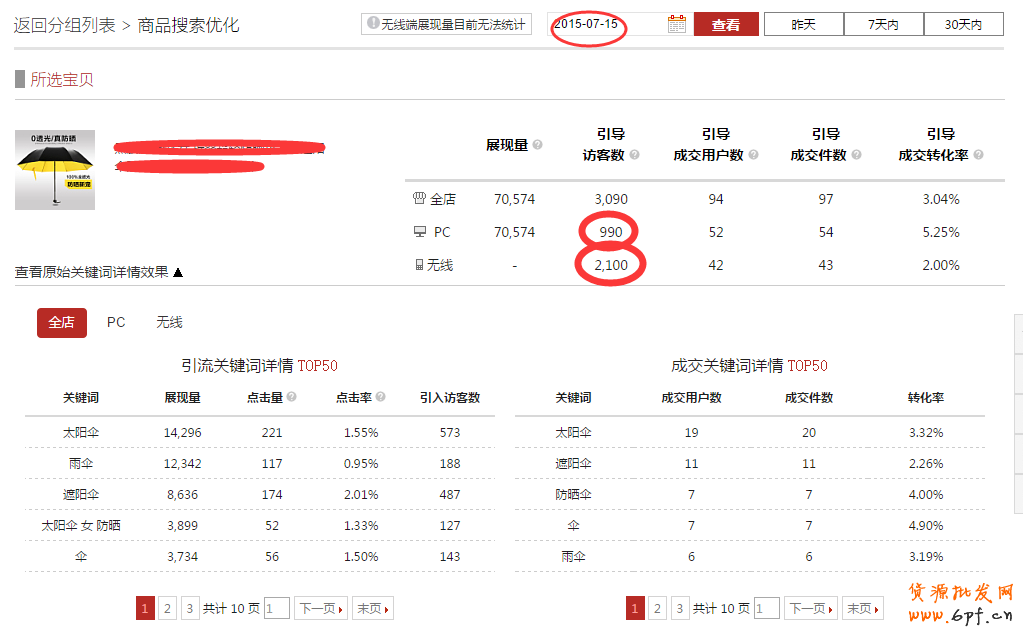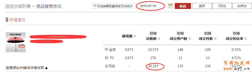 “手機(jī)傘”這個詞在7.16無線端搜索框有推薦,所以產(chǎn)品使用之后搜索流量跟成交量都有很大的一個提升。這種詞的特點是 使用周期短,搜索流量大,轉(zhuǎn)化不是很高。