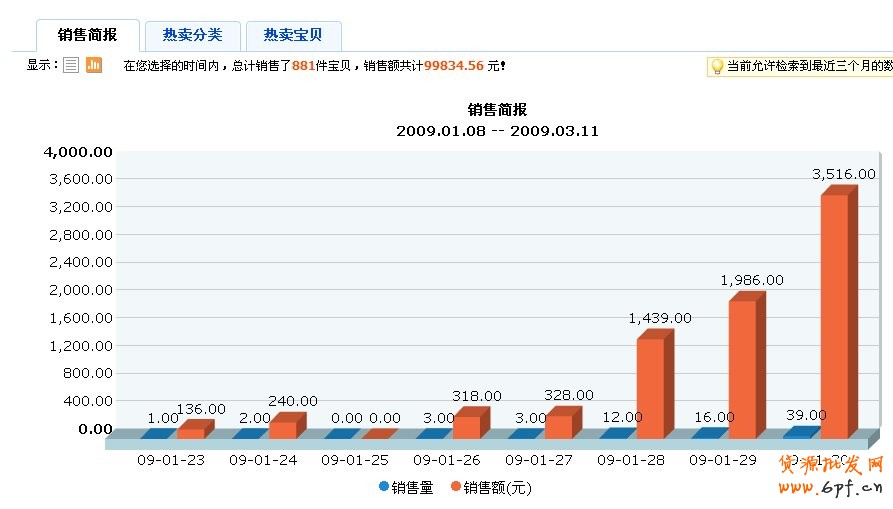 開店至今除第一周外,連續(xù)八周在“運(yùn)動(dòng)/瑜伽/健身/球迷用品”類別中,支付寶交易額排名都在前500名內(nèi),最高沖到第48名,截至3月11日止,總計(jì)銷售了:881件寶貝。銷售總額共計(jì)99834.56 元整!
