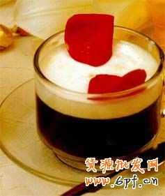 法國人對紅酒的鐘愛猶勝與俄羅斯人對伏特加,巴西人對咖啡。他們不愿意紅酒攙雜任何別的物質。Burgundy Coffee卻是一種將紅酒與咖啡融合在一起的花式咖啡。我在想這種咖啡應該是愛浪漫的法國人設計的,因為它的制作過程中充滿了紅色的爛漫。先將鮮奶油與紅酒攪拌一下,然后打沫,打出來后你會發現紅色的奶沫是那么別有韻味,含蓄卻又充滿了挑逗。在已暖完杯后的馬克杯底先加入一點紅酒,然后將做好的咖啡與砂糖到入(咖啡是意式濃縮咖啡),最后將打好的紅色泡沫放入。一杯浪漫的Burgundy咖啡就做成了。