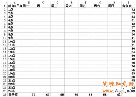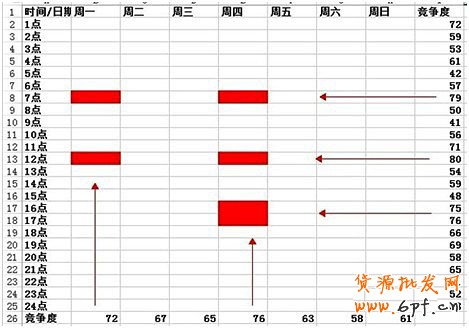 將競爭度填進去之后,就變成了這種格式,之后我們就可以很容易利用這個表格找個哪天的哪個時間段競爭度最低了,之后我們就將競爭度低的時間段利用紅色給標出來,方便查看,如圖:
