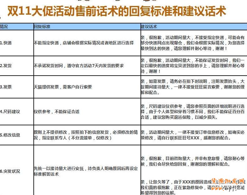 六、雙11大促活動售前話術的回復標準和建議話術  七、 雙11前客服培訓考核安排
