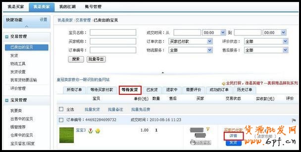 賣家登錄到“賣家中心”—“發貨”—“等待發貨的訂單”在具體的訂單后點擊“發貨”