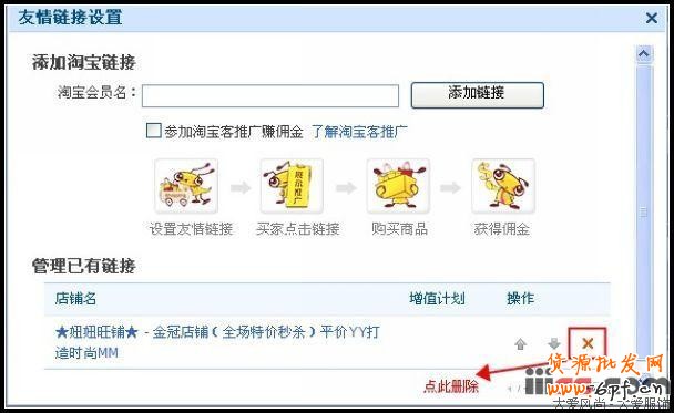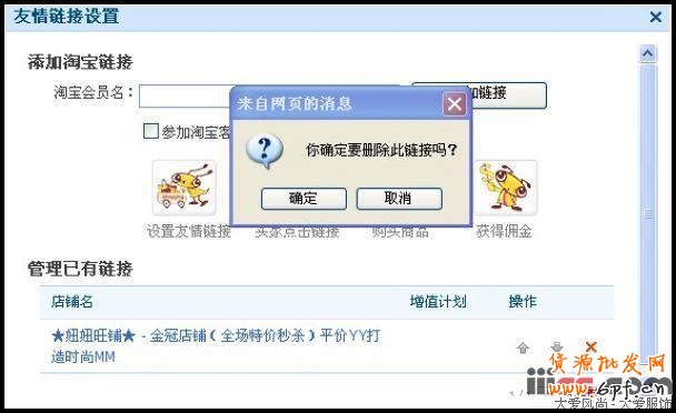 回答:您登錄“我的淘寶”— “管理我的店鋪”— “店鋪裝修”— “友情鏈接”進入設置頁面,管理已有的鏈接,找到您要刪除的店鋪名,點擊“X”進行刪除即可。如下圖: