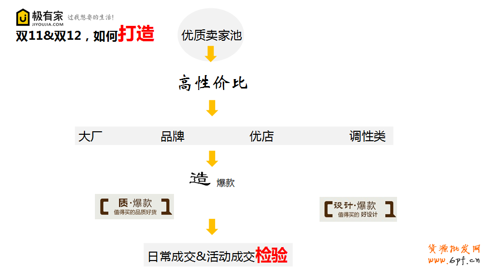 其中一部分很大的流量來自于大家日常成交情況,雙十一雙十二購買轉(zhuǎn)化率將會成倍增長,好的店鋪會提升到10倍,所以日常成交也是小二非常看重的一點,平臺內(nèi)有很多新近入淘的商家,例如大廠類、品牌類、調(diào)性類,以往淘寶店鋪會通過3-5年時間去培育自己的店鋪達到top的地位,現(xiàn)在極有家也會針對有優(yōu)秀制造能力的貨品,會幫助商家去造爆款,一類是品質(zhì)類的質(zhì)爆款,一類是設計類的爆款。