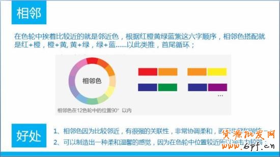 在色輪中挨著比較近的就是鄰近色,根據紅橙黃綠藍紫這六字順序,相鄰色搭配就是紅+橙,橙+黃, 黃+綠,綠+藍……以此類推,首尾循環;