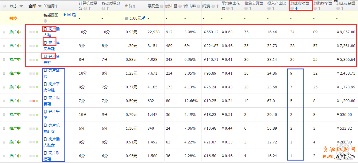 根據推廣效果,對寶貝的關鍵詞進行拓展,從上圖可以看出紅框內的關鍵詞促進的轉化筆數較多,ROI也較可觀,這些詞都有一個相同的屬性詞“亮片”,籃框內的關鍵詞則是根據該屬性進行拓展的關鍵詞,引進的流量不多,但能帶來轉化。