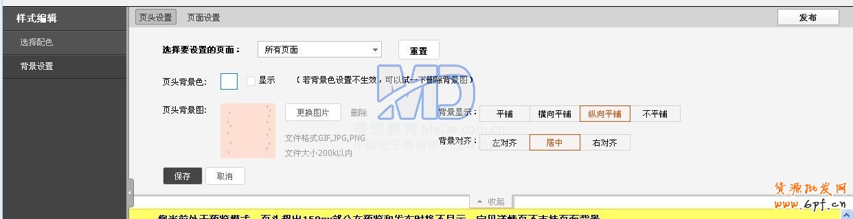 3、在頁頭設置上傳圖2,就是我們在PS中處理存儲尺寸為1500*150的圖片2。選擇不平鋪,居中。