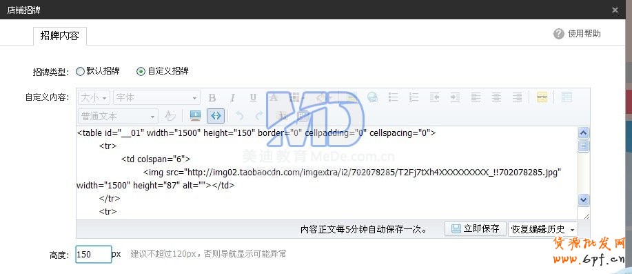 21.我們先設置店招,選“自定義店招”,將我們剛剛修改好的代碼復制到編輯框里,還要將高度設置為150px。