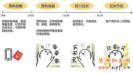 CRM雙十一活動預熱專區中的攻略區部分,將按照時間軸將整個雙十一活動分為預熱前期(10.8-10.31)、預熱高潮(11.1-11.10)、狂歡節(11.11)和狂歡節后(11.12-)四個階段。在每個階段根據階段性預熱目標除了給出詳細的操作攻略以外,還串聯了很多今年雙十一活動的無線互動玩法,統一提供使用入口,是賣家可快速上手的實戰攻略。