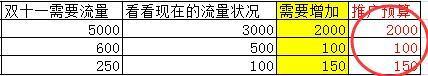 有了以上的基礎數據,我們要最后根據雙十一活動推廣工具或者渠道所要花費的費用,按1元一個流量算,我們就會很容易得出雙十一活動的費用預算: