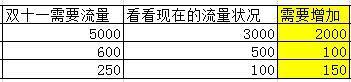 接著,用預估出的雙十一活動所需流量,和咱們店鋪現在的流量狀態,相減即可得到雙十一活動所需要增加的流量數: