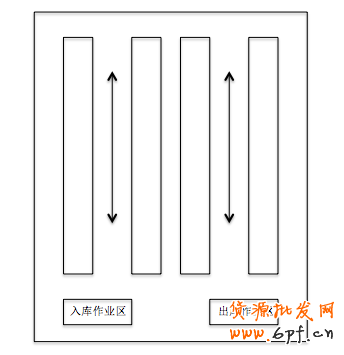 從揀貨通道的中點處將分揀區域分成前后兩部分。揀貨人員從通道的一端進入,揀取完貨物后回轉折返,最遠處就是該通道中點,當揀貨人員離開揀貨區域的前半部時,揀貨員要從最右邊的通道穿越進入通道后半部分,以同樣方法開始后半部分的揀貨。當后半部的揀貨完成后,穿越最左邊的通道回到出人口。