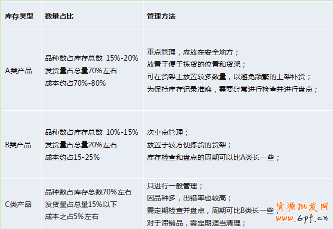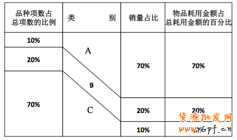將累計配貨次數為50%的前若干品種定為A類;將配貨次數為20%左右的若干品種定為B類;將其余的品種定為C類。如: