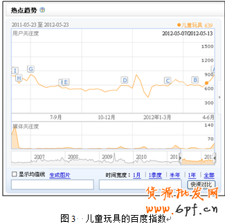 在打開的“百度指數(shù)分析”頁面中,輸入目標(biāo)關(guān)鍵詞“兒童玩具”,完成后單擊右側(cè)的“查詢”按鈕。你可以發(fā)現(xiàn)這里出現(xiàn)了很多相關(guān)的關(guān)鍵詞,“指數(shù)”顯示的數(shù)字就是百度指
