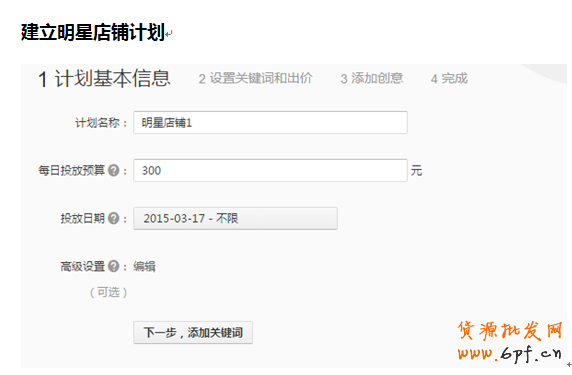 鉆展日限額最低為300元,而明星店鋪日限額的多少主要是取決于前期在申請品牌擴展詞數量的多少,如果品牌詞足夠多的話,日限額可以稍微設置高一些,因為明星店鋪計劃的搜索都是品牌詞,用戶搜索的目的性較強,因此點擊率和轉化都是比較高的,本店因為前期的品牌擴展詞不是很多,只有大概40個擴展詞,因此小編這邊設置的日限額是300元,投放日期從設置日開始可以往后不限時間設置,該項可以根據自己的實際情況自由選擇計劃的生效時間。