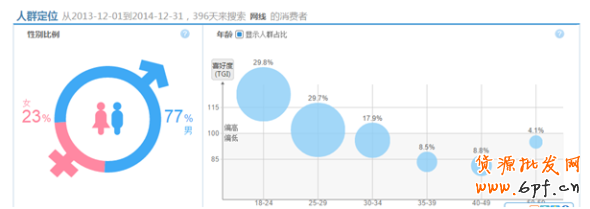 根據淘寶指數顯示的人群定位圖表可以針對網線類目的受眾群進行分析,因為網線作為3c數碼電子元器件市場的寶貝,一般的男性接觸得比較多,因此在網線整體的搜索指數中,有77%是男性群體,同時有超過58%的年齡是在18-29歲,整體用戶群是偏年輕的群體。故針對行業和店鋪本身的主營類目確定出本店的核心受眾為18-29歲之間的男性群體。后續在相關的推廣營銷中,可以將該類客戶作為店鋪的定向客戶,讓寶貝盡可能展現在有需求的用戶面前。