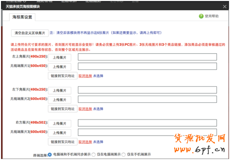 添加圖片+url,必須上傳3張圖片,無線和pc需要分別上傳,共計6張。url必須是通過審核的寶貝,且在架有庫存狀態,否則整個區域無法展示